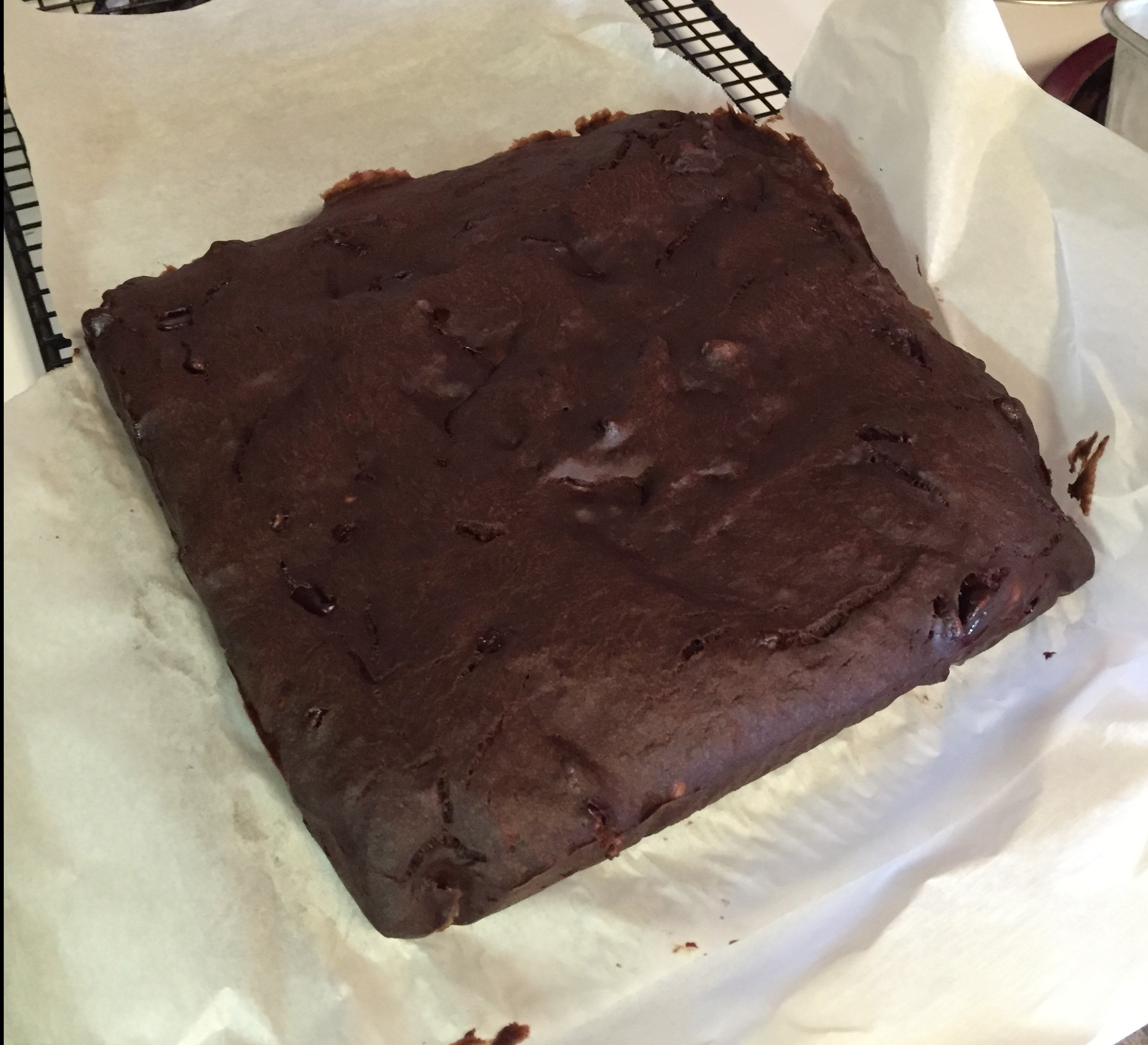 - Then, carefully holding all four pieces of parchment paper, lift brownies out of pan and onto cooling rack