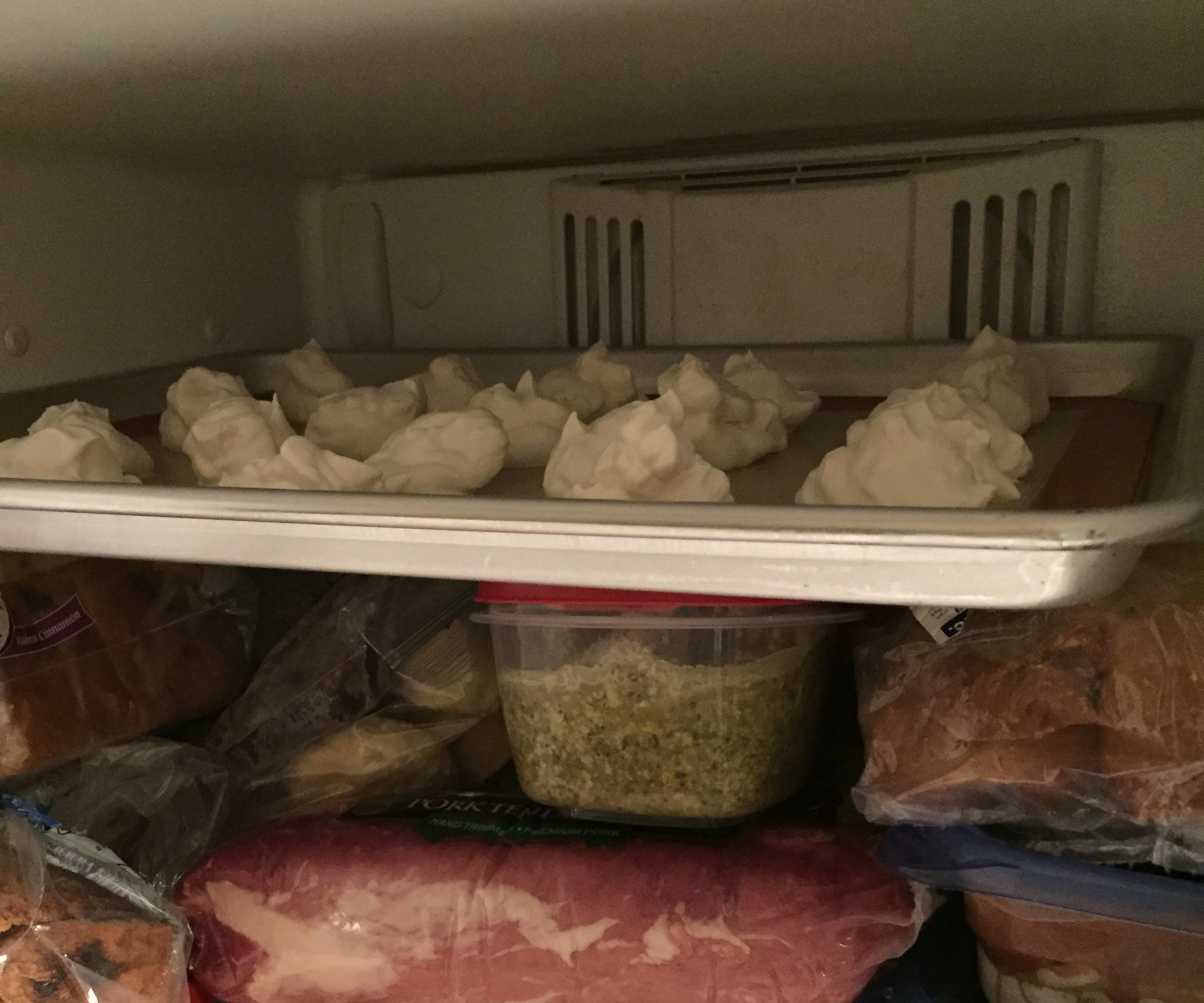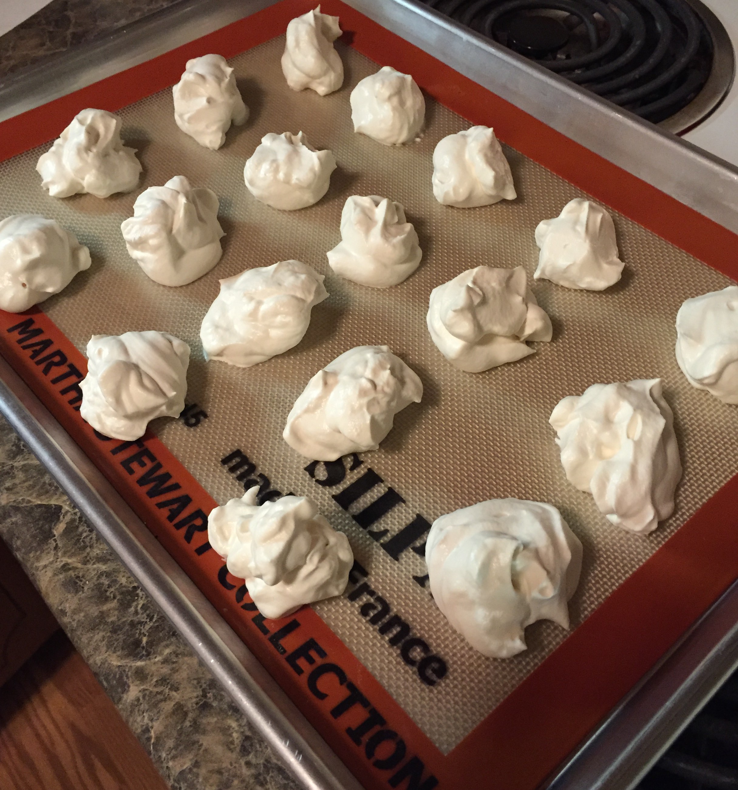 - On your prepped baking sheet use a pastry bag or a spoon to place tablespoon-sized dollops of dough about an inch apart on the baking sheet