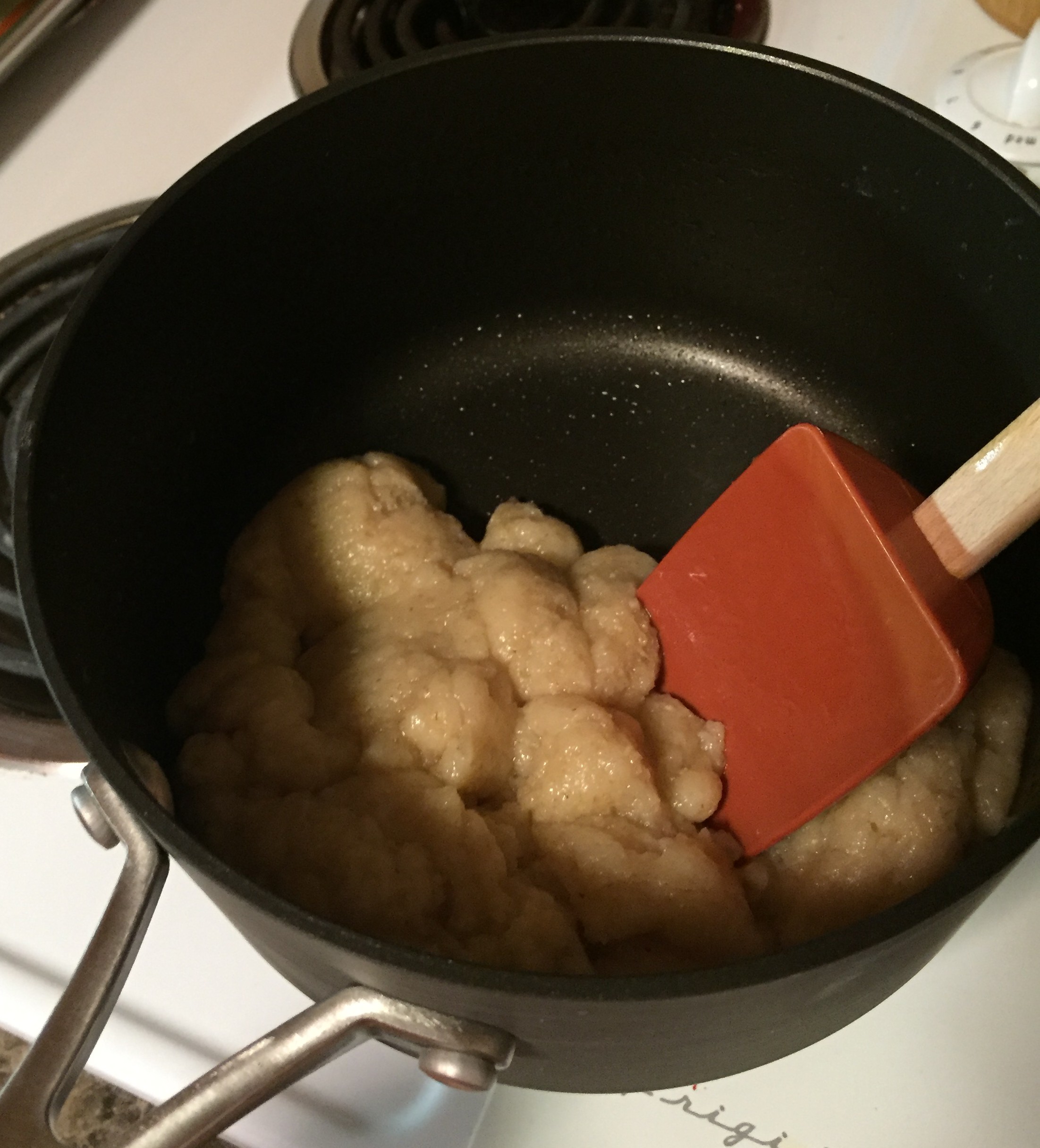 - After its begun to form into a ball, remove from heat and continue to beat for another minute or so until it has a slight sheen and maintains it spherical shape